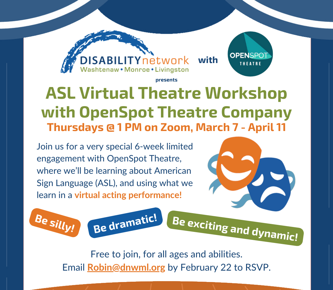 Join us for a very special 6 week limited engagement with Openspot Theatre happening VIRTUALLY on Zoom! This class welcomes ALL abilities ages 14+ and will focus on the art of acting and communicating using American Sign Language!