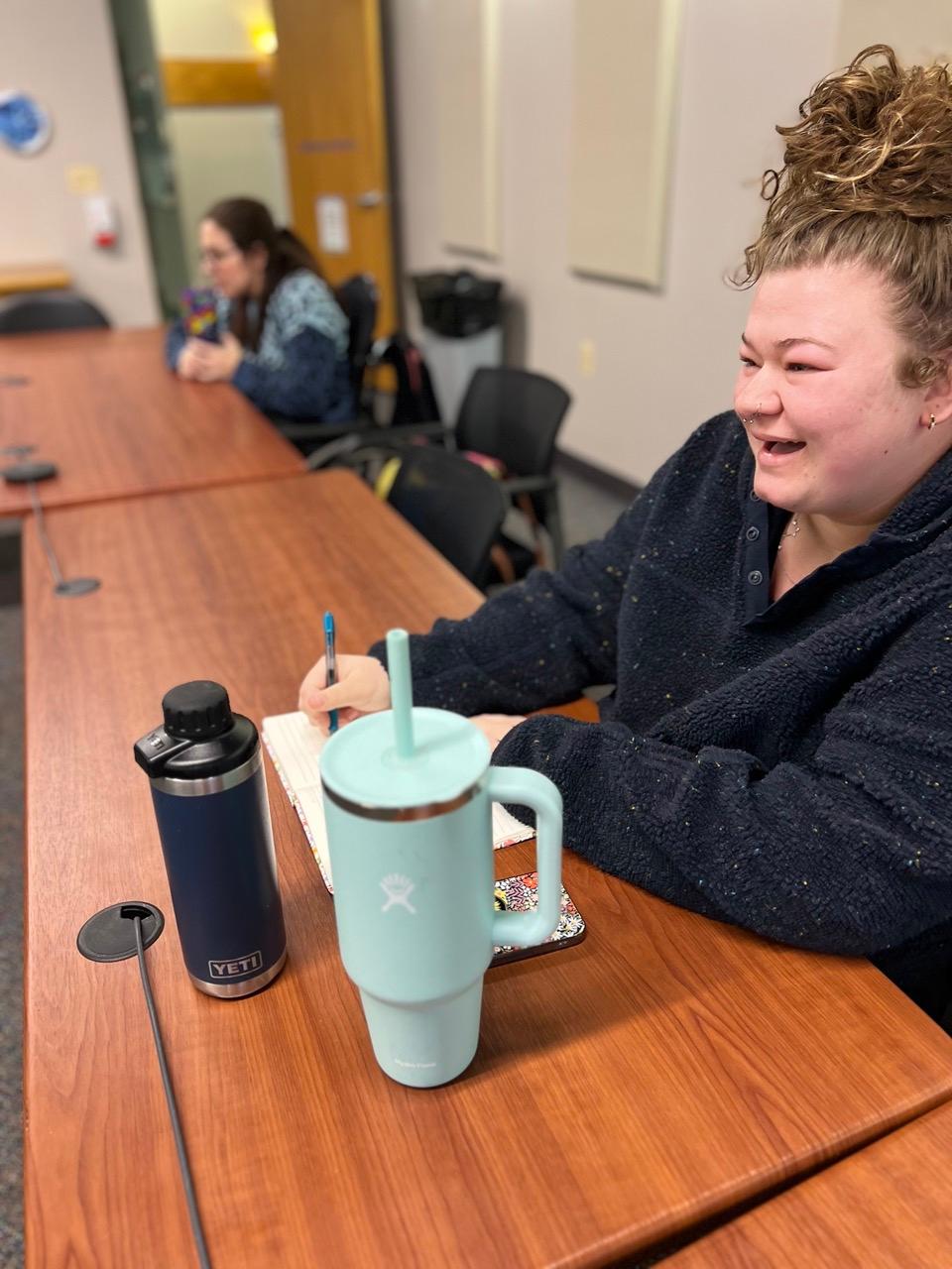 Image description: Kari, who has fair skin and light brown curly hair piled in bun on top of their head, sits at a table with a large coffee cup and water bottle in front of them. They’re wearing a dark gray pullover and laughing.