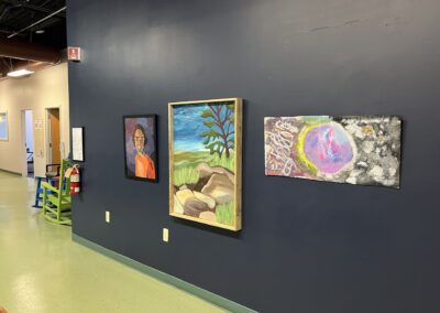 “This group painting was created by 4 artists with disabilities who participate in the MRC artWorks skill-building program located on the beautiful and historic Kalamazoo Mall. Utilizing a found and partially painted canvas, each artist selected a unique creature to contribute, enhancing the collaborative effort. This project merges and blends various painting styles and techniques, showcasing a unified artistic experience.”