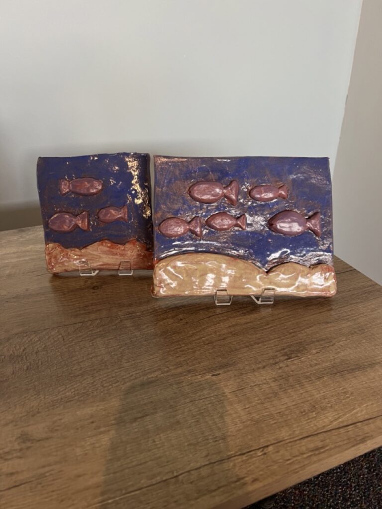 A two-panel tile of fish, water, and sand.